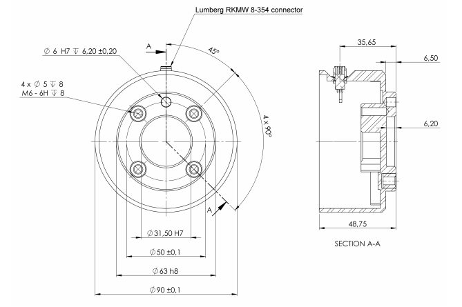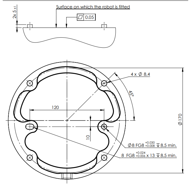 使用預留的兩個Ø8孔和一個銷釘來準確地重新定位機器人手臂。注意:可以采購精確的基座作為附件來使用。圖4.1顯示了鉆孔位置和螺絲安裝位置。