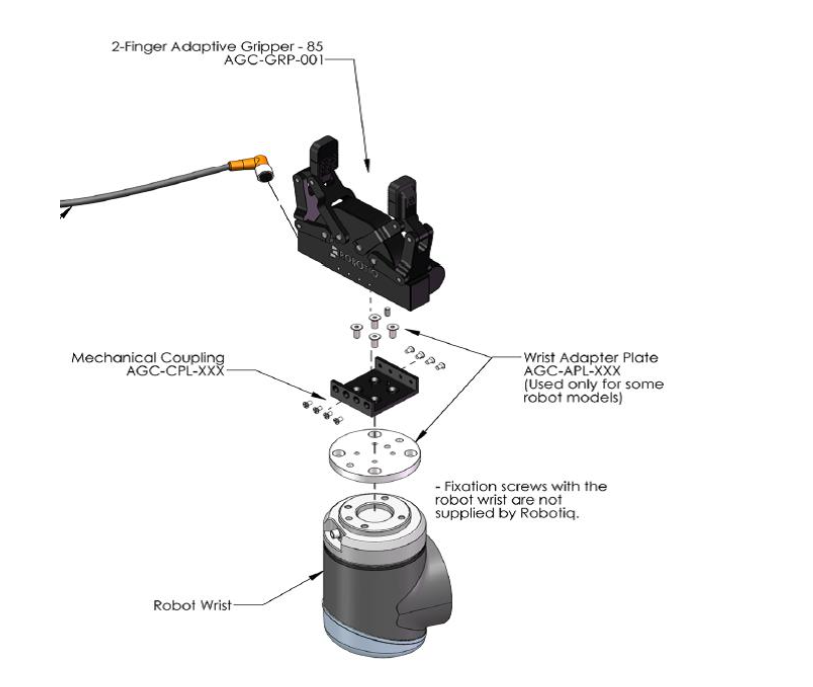 請注意,Robotiq僅提供螺釘和螺絲刀,用于將夾具固定到機械聯軸器和轉接板上。將整個末端執行器連接到機器人腕部所需的螺釘或螺絲刀不由Robotiq提供,但應由您的機器人制造商提供。
