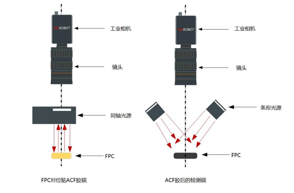 FPC與ACF膠對位貼合的系統(tǒng)方案包括FPC對位貼合ACF膠和貼合后的產品檢測兩部分,這都需要使用???a href="http://m.bssteel.com.cn/computar/">工業(yè)相機來實現(xiàn)。
