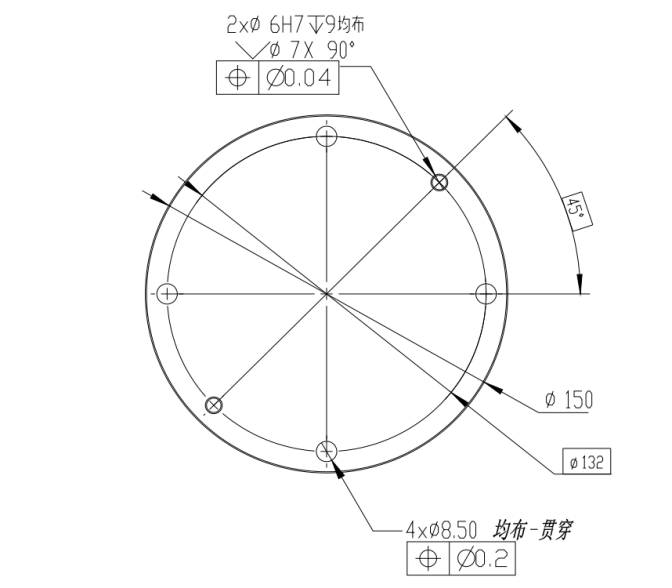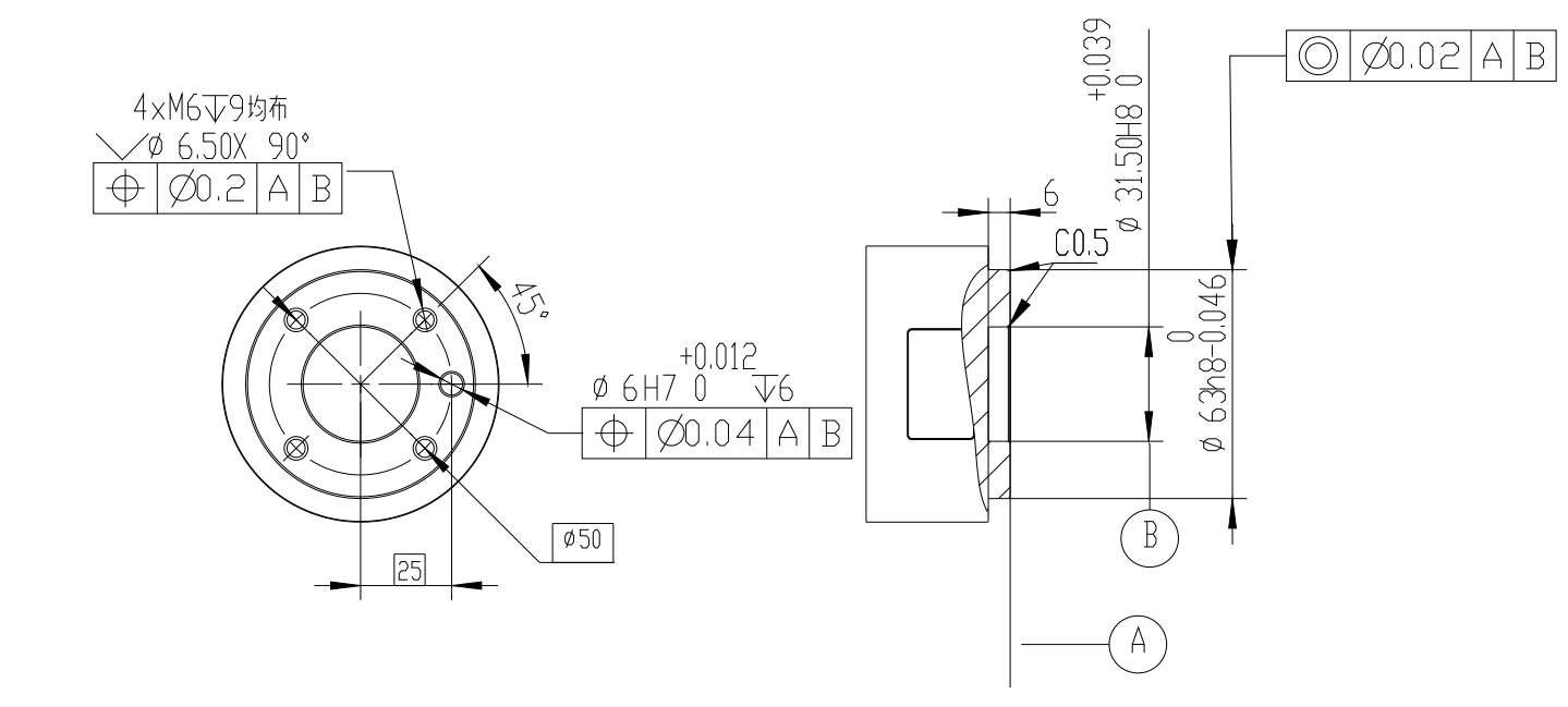 工具法蘭有四個 M6 螺紋孔和?個 Ф6 定位孔,可以?便地將夾具安裝連接到機器? 末端。?具法蘭機械尺?如圖1-3所示。
