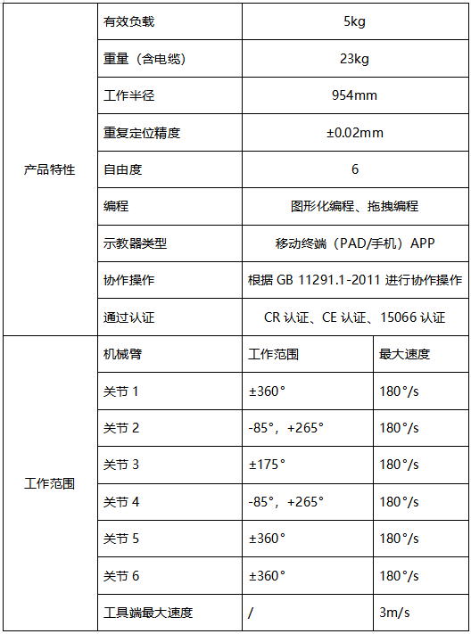 JAKA Ai 5有效負(fù)載5kg,工作半徑能達(dá)954mm,重復(fù)定位精度誤差在0.02mm范圍,能夠通過移動終端(PAD/手機)APP進行操作。JAKA Ai 5通過以太網(wǎng)接口能分辨的像素高達(dá)500w,鏡頭焦距能達(dá)8mm。產(chǎn)品已通過CR認(rèn)證、CE認(rèn)證、15066認(rèn)證。