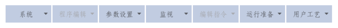 主菜單區的選項主要用于各項參數設置,程序指令編輯,用戶工藝設定等,包含系統、程序編輯、參數設置、監視、編輯指令、運?準備、用戶工藝幾項。