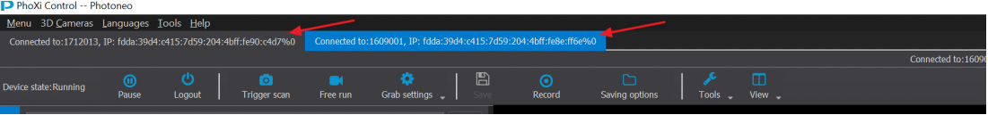 連接到第一臺(tái)掃描儀,然后單擊菜單->網(wǎng)絡(luò)發(fā)現(xiàn),然后單擊要連接的第二臺(tái)掃描儀。然后,您將有兩個(gè)選項(xiàng)卡,如下圖所示,然后您可以通過(guò)單擊它們?cè)谶@兩個(gè)選項(xiàng)卡之間進(jìn)行更改。