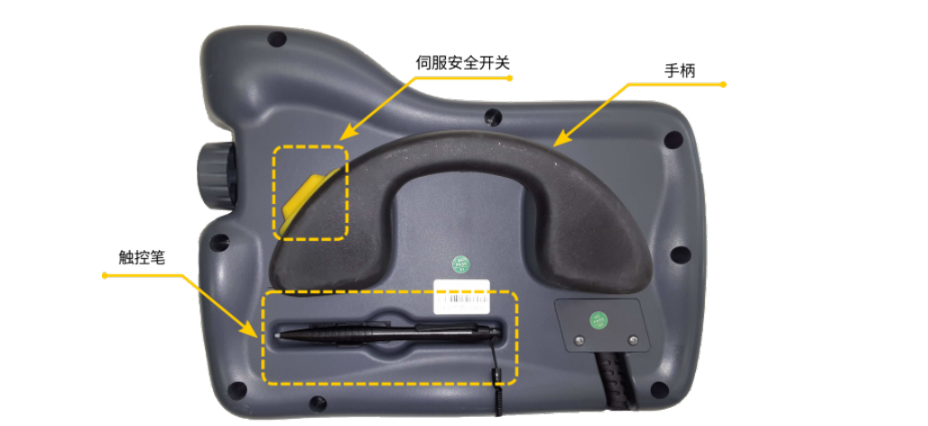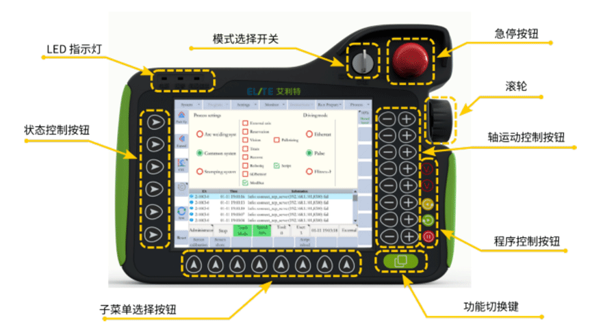 示教器是機(jī)器人進(jìn)行編程的地方。用戶可以使用觸摸屏選擇選項(xiàng),也可以使用觸摸屏周圍的 物理按鈕激活其他選項(xiàng)或功能。示教器的正面及其顯示屏和按鈕如圖1所示。