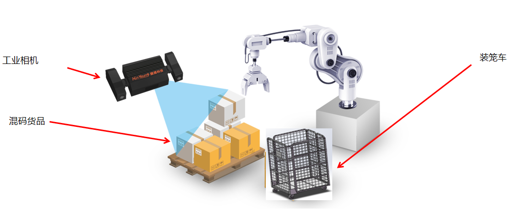 通過(guò)3D視覺(jué)系統(tǒng)引導(dǎo)機(jī)器人碼件,能夠?qū)崟r(shí)捕捉籠車(chē)位置、狀態(tài)和貨物信息,實(shí)現(xiàn)對(duì)籠車(chē)混碼情況的準(zhǔn)確識(shí)別和指導(dǎo),很大程度上降低了人力成本。