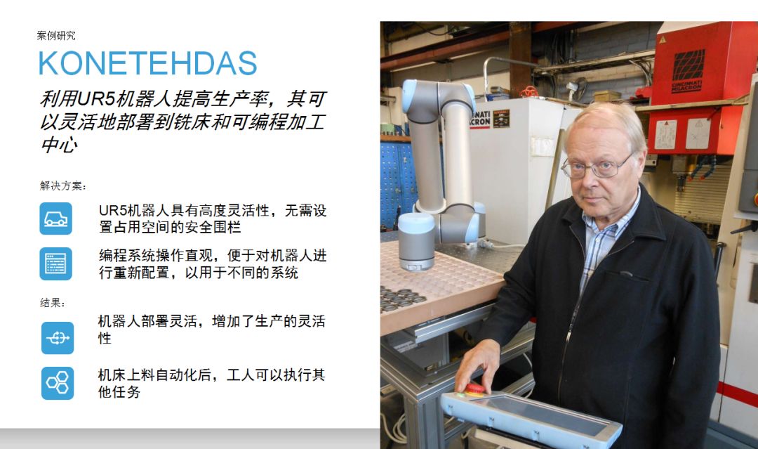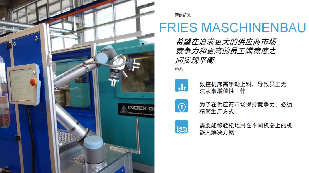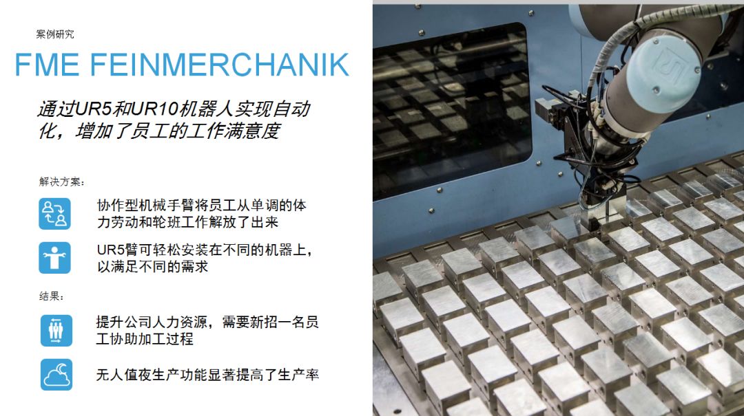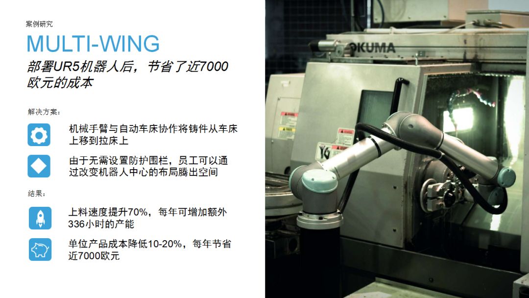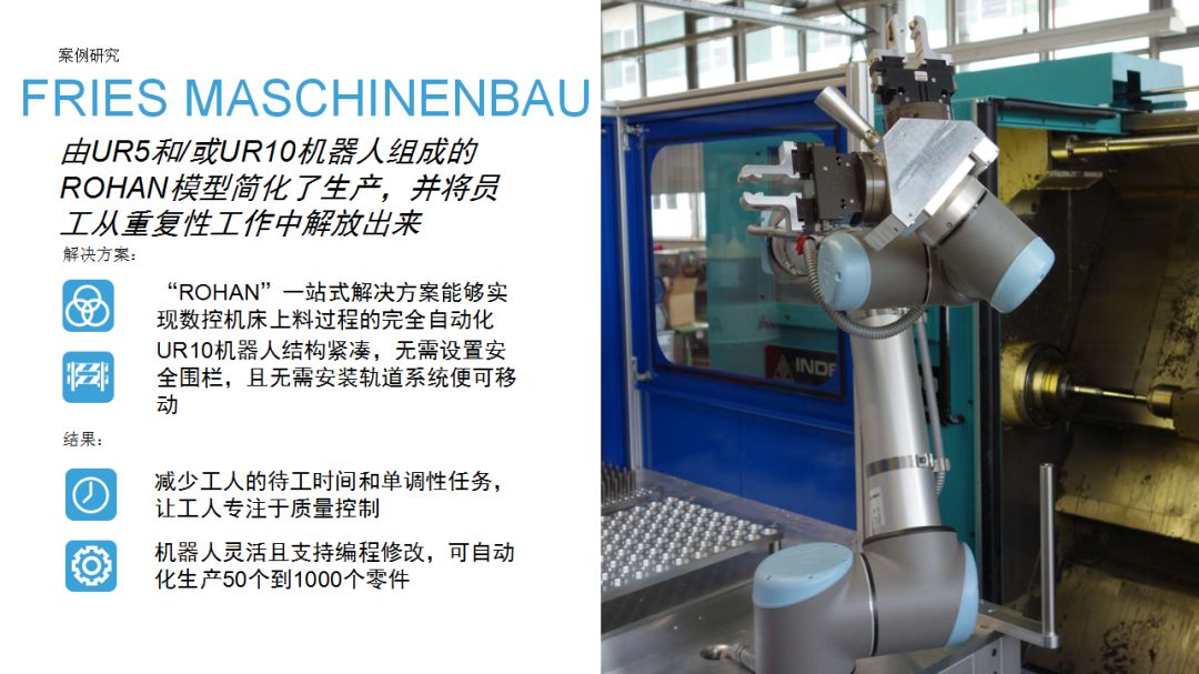 UR機(jī)器人為企業(yè)提供了一種思路:相比傳統(tǒng)工業(yè)機(jī)器人,協(xié)作機(jī)器人成本較低,占地空間小,導(dǎo)入現(xiàn)有工作流程時(shí)無(wú)需對(duì)產(chǎn)線進(jìn)行復(fù)雜和昂貴的重新部署,項(xiàng)目集成周期短。優(yōu)傲機(jī)器人始終堅(jiān)信,協(xié)作機(jī)器人擁有巨大的潛力,能夠在廣泛的應(yīng)用場(chǎng)景下協(xié)助人類工作。本期內(nèi)容中,協(xié)作機(jī)器人用于金屬加工和機(jī)床上下料,希望這些案例能夠?yàn)橛蓄愃茍?chǎng)景的用戶提供借鑒。