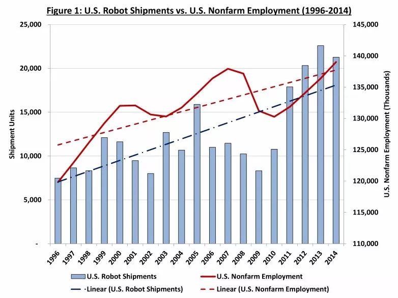 美國(guó)推進(jìn)自動(dòng)化協(xié)會(huì)發(fā)表的一份名為《機(jī)器人推動(dòng)了美國(guó)生產(chǎn)率和就業(yè)增長(zhǎng)的新浪潮》的報(bào)告討論了這一問(wèn)題。摘自該報(bào)告的以下圖表顯示了美國(guó)20年來(lái)就業(yè)增長(zhǎng)與機(jī)器人出貨記錄的關(guān)系,表明機(jī)器人的使用與就業(yè)的總體改善齊頭并進(jìn)。