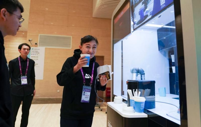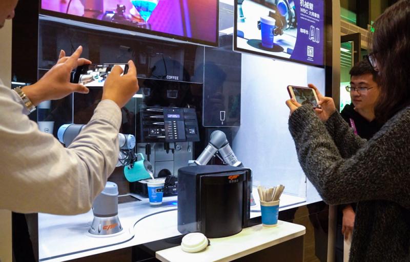“四葉草”國家會展中心的新聞中心二樓入口,一臺機械臂組成的無人咖啡亭成為中外記者的焦點。