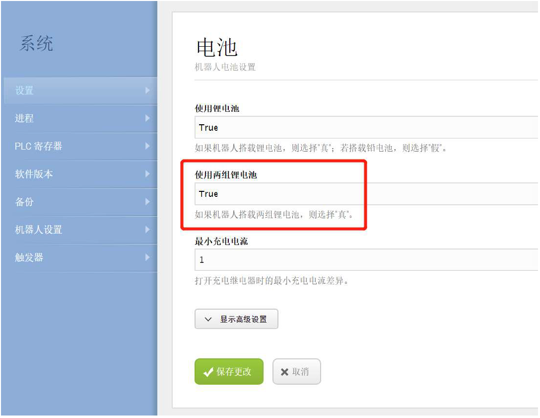 在MiR機器人操作界面“系統(tǒng)>設(shè)置>電池”選項內(nèi)設(shè)置使用兩組鋰電池為:true, 并保存更改。