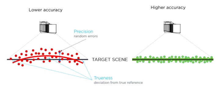 如圖所示,準確性應(yīng)該同時滿足精度和真實性因素。需要強調(diào)的是,準確性將根據(jù)工作距離、環(huán)境溫度、環(huán)境光和相機設(shè)置等條件而有所變化。