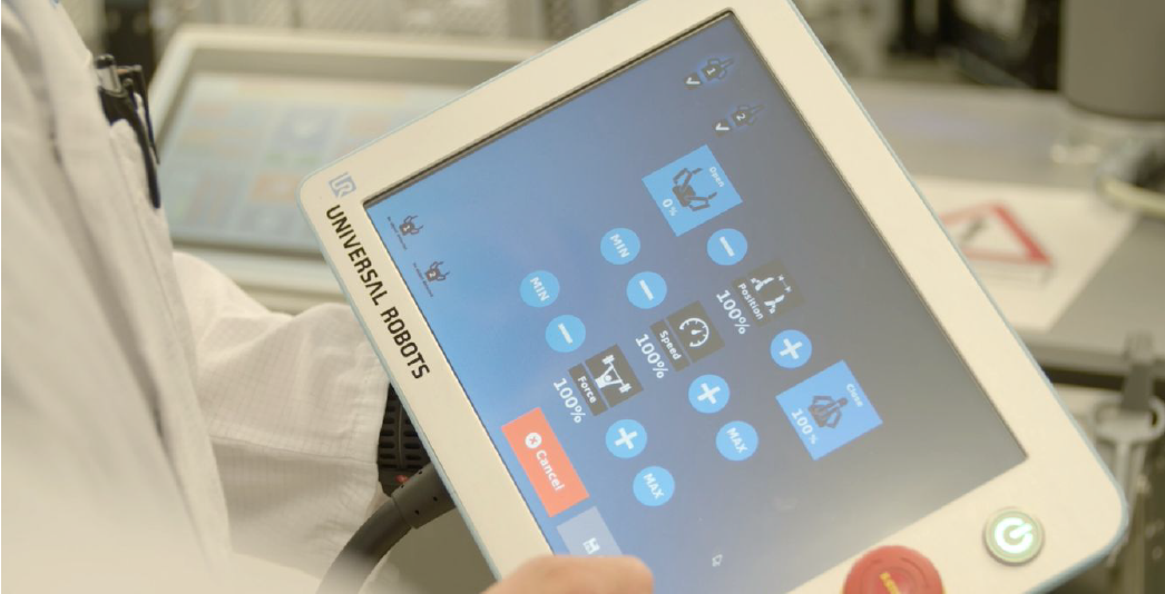 整個質量測試應用程序均由人機界面控制,獨立于Universal Robots示教器。 機器人首先接收到信號,以便同時使用兩個Robotiq 2F-85自適應抓爪來管理計算機。 然后,機器人將讀取計算機的條形碼。 Robotiq FT 300可幫助放置計算機以讀取條形碼。 完成此操作后,將計算機放置在質量測試單元中。 Grippers / FT 300組合每次都能確保完全相同的定位。 然后組合桿關閉杠桿,測試階段開始。 測試完成后,除條形碼讀取外,將反向執行相同的過程。