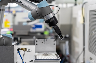 APN在加拿大魁北克市為航空航天業(yè)生產(chǎn)高精度零件。 為了每天從九臺(tái)CNC機(jī)床中獲得更多收益,他們使用Universal Robots UR5和Robotiq 2F-85自適應(yīng)抓取器和手腕相機(jī)實(shí)現(xiàn)了零件處理任務(wù)的自動(dòng)化。 在花了一年時(shí)間對(duì)他們的第一個(gè)機(jī)器人單元進(jìn)行微調(diào)之后,他們?cè)谒膫€(gè)月內(nèi)將其復(fù)制了八次。