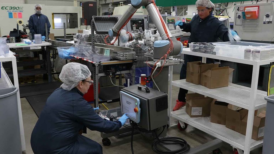 D公司 的注塑成型生產人員安排遇到困難,公司希望能夠充分利用現有勞動力。UR機器人提供的三臺協作式機械臂現已接管了一些重復性任務,這不僅提高了產品一致性,同時還使生產能力翻了兩番。