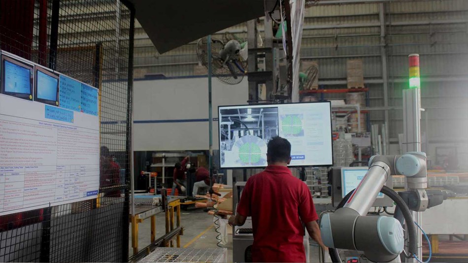 L公司部署了UR10協作機器人來處理銅管擴展任務。攝像機與視覺系統集成在一起,拍攝了管殼式熱交換器的照片,并檢測了銅管的輪廓。還對協作機器人進行了編程,使其每5個循環將擴展工具浸入清潔劑和潤滑劑中一次。