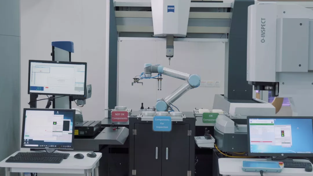1臺UR5機器人可以對接3種測量設備:三坐標測量機、仿形機床和一臺非接觸式測量機協作式機器人根據相關程序掃描每個組件的條碼,將其放置到每臺機器上檢查。檢查后,測量機向協作式機器人發送組件是否可用的信息。協作式機器人據此依次分揀零件,將零件放置在“合規”或“不合格”的箱子中。程序調用和機器人部署在不同工位的流程非常高效:協作式機器人通過無縫、無故障的切換方式靈活適應生產線,1-2天即可即切換工位。