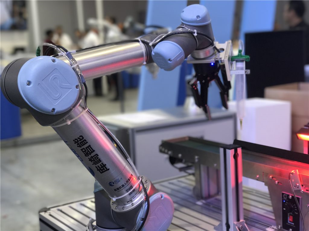 技術描述:UR機器人6軸均可實現±360度旋轉,工作范圍近似球體,針對各種復雜的產品結構都可實現靈活的點膠軌跡。同時,UR機器人采用獨特的力控保護,在產線上與工人在同一環境下工作,無需增加防護欄,完美解決了工廠空間有限,設備部署緊湊的問題。利用UR機器人自帶的輸送帶跟蹤模塊,快速實現生產線的在線追蹤。