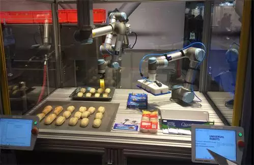 優(yōu)傲機器人公司出品的人機協(xié)作機器人在食品加工環(huán)境中已證明具備用武之地。食品加工對其環(huán)境的溫濕度條件和衛(wèi)生狀況有特定的要求。優(yōu)傲機器人可以在環(huán)境溫度0°C到50°C之間、含氧量相對較低的環(huán)境下正常工作工作,而這對于人工來說則必須配備特殊的設(shè)備。