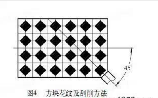 方塊花紋如圖4所示。刮花前要在工件表面用鉛筆劃出一定間距的方格。刮花時,刀身平面中心線與工件表面縱向中心線成45°角,從工件的前面向后面進行刮削。基本刮法是:采用直線刃(或大半徑圓弧刃)窄刮刀進行短程推刮,刮出第一個方塊后,應間隔一個方塊距離即空出一格再刮出第二個方塊。