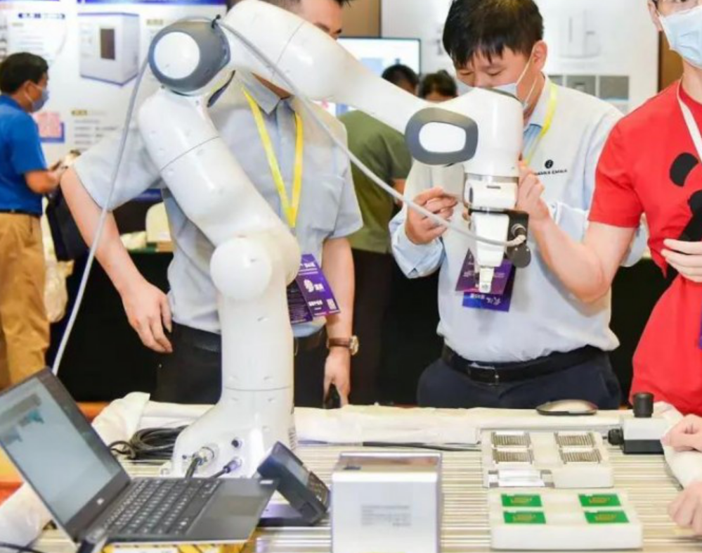 演講的間隙,參會嘉賓們來到了本次活動的產品展示區,并與來自國際和國內的知名產品和服務提供商代表進行了近距離溝通。交流期間,Franka展區人頭攢動。工程師們親自上陣并動手體驗了我們的Franak力控協作機器人,紛紛夸贊。