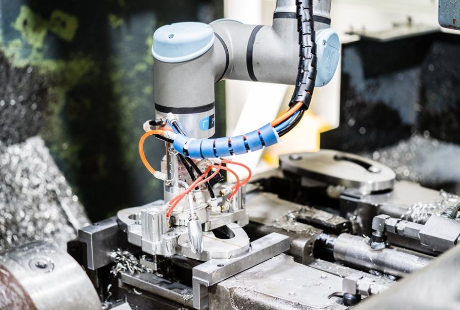 于是,Ket-Met便購入了UR10協(xié)作機器人,用來提高自動車床的產(chǎn)量,安裝和編程花了兩周時間。優(yōu)傲將工作件移動到車床或銑床上,等待其完成加工,然后將成品運輸?shù)较礈旎@中進行清洗。